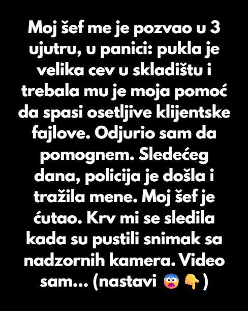 Moj šef me je pozvao u 3 ujutru, u panici: pukla je velika cev u skladištu i trebala mu je moja pomoć da spasi osetljive klijentske fajlove. Odjurio sam da pomognem. Sledećeg dana, policija je došla i tražila mene. Moj šef je ćutao. Krv mi se sledila kada su pustili snimak sa nadzornih kamera.