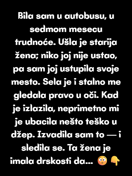 Bila sam u autobusu, u sedmom mesecu trudnoće. Ušla je starija žena; niko joj nije ustao, pa sam joj ustupila svoje mesto. Sela je i stalno me gledala pravo u oči.