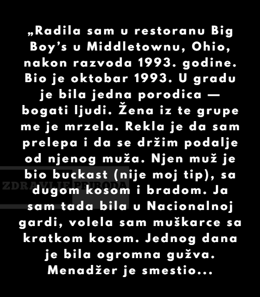 „Radila sam u restoranu Big Boy’s u Middletownu, Ohio, nakon razvoda 1993. godine. Bio je oktobar 1993. U gradu je bila jedna porodica — bogati ljudi.