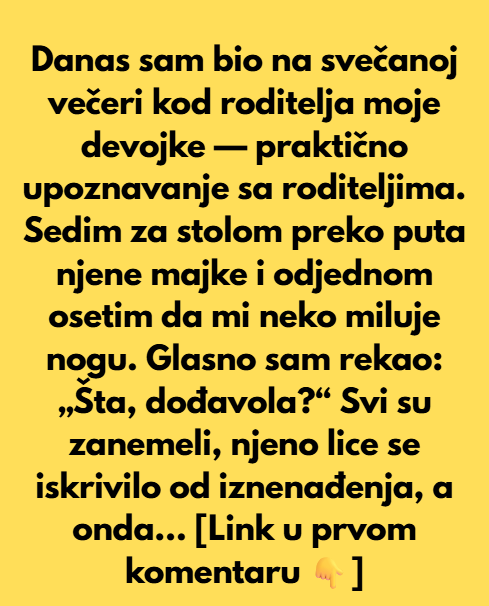 Danas sam bio na svečanoj večeri kod roditelja moje devojke — svojevrsno upoznavanje sa roditeljima. Sedeo sam za stolom preko puta njene majke i odjednom osetio kako mi neko miluje nogu. Glasno sam rekao: „Šta, dođavola?“ Svi su zanemeli, njeno lice se iskrivilo od iznenađenja, a onda se ispod stola pojavila mačka.