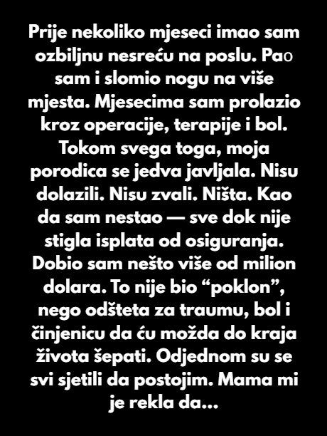 Prije nekoliko mjeseci imao sam ozbiljnu nesreću na poslu. Paо sam i slomio nogu na više mjesta. Mjesecima sam prolazio kroz operacije, terapije i bol. Tokom svega toga, moja porodica se jedva javljala. Nisu dolazili. Nisu zvali. Ništa. Kao da sam nestao — sve dok nije stigla isplata od osiguranja. Dobio sam nešto više od milion dolara. To nije bio “poklon”, nego odšteta za traumu, bol i činjenicu da ću možda do kraja života šepati.
