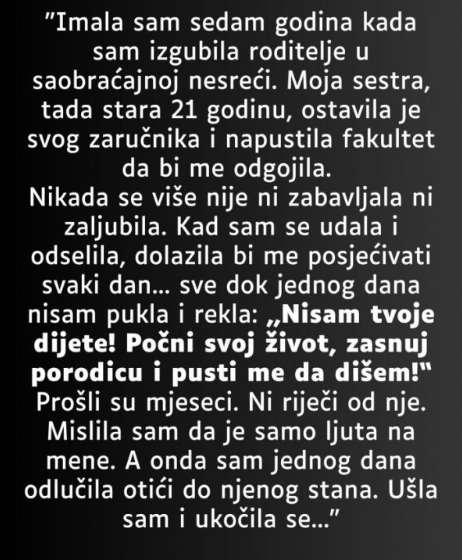 Naratorica ove priče izgubila je roditelje kada je imala samo sedam godina. Nesreća je došla naglo, bez upozorenja, ostavljajući dvije sestre potpuno same pred svijetom. Starija, tek stasala u odraslu osobu, imala je samo dvadeset jednu godinu kada je donijela odluku koja je zauvijek promijenila njihov životni put. Napustila je fakultet, odgodila vjenčanje, prekinula sve planove koje je tek počela graditi — i postala majka djetetu koje je ostalo iza tragedije. U trenutku kada je sve stalo, ona je odlučila biti i sestra i roditelj.