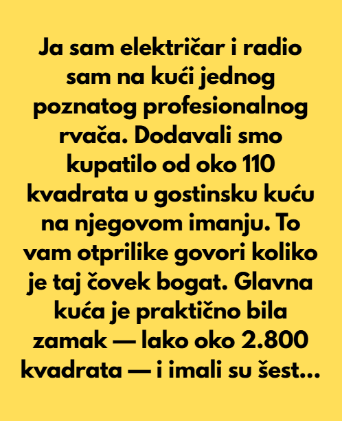 Ja sam električar i radio sam na kući jednog poznatog profesionalnog rvača. Dodavali smo kupatilo od oko 110 kvadrata u gostinsku kuću na njegovom imanju. To vam otprilike govori koliko je taj čovek bogat. Glavna kuća je praktično bila zamak — lako oko 2.800 kvadrata — i imali su šest nemačkih psa koje su vršile nuždu svuda po kući. Oni bi jednostavno ostavljali te ogromne gomile po mermernim podovima svoje kičaste vile dok čistači ne bi dolazili svakog dana da to počiste. I nisu oni jedini bogati ljudi koje sam znao da se tako ponašaju.