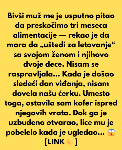 Moj bivši muž me je usputno pitao da preskočimo tri meseca alimentacije — trebalo mu je da „uštedi za letovanje“ sa svojom ženom i njihovo dvoje dece. Nisam se raspravljala…