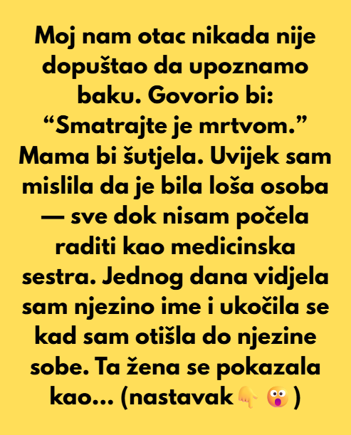 Moj nam otac nikada nije dopuštao da upoznamo baku. Govorio bi: “Smatrajte je mrtvom.” Mama bi šutjela. Uvijek sam mislila da je bila loša osoba — sve dok nisam počela raditi kao medicinska sestra.