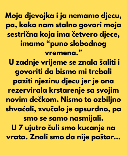 U 7 ujutro čuli smo kucanje na vrata. Znali smo da nije poštar — oni ne dolaze tako rano — i nismo očekivali nikoga.