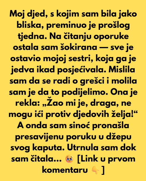 Bila je to prava oporuka. I na njoj je bilo samo jedno ime — moje. Djed je sve ostavio meni — svoju malu kuću, stari automobil i ušteđevinu. Uz to je bila i njegova poruka, podsjetnik da je na meni odluka hoću li to podijeliti sa sestrom ili ne.