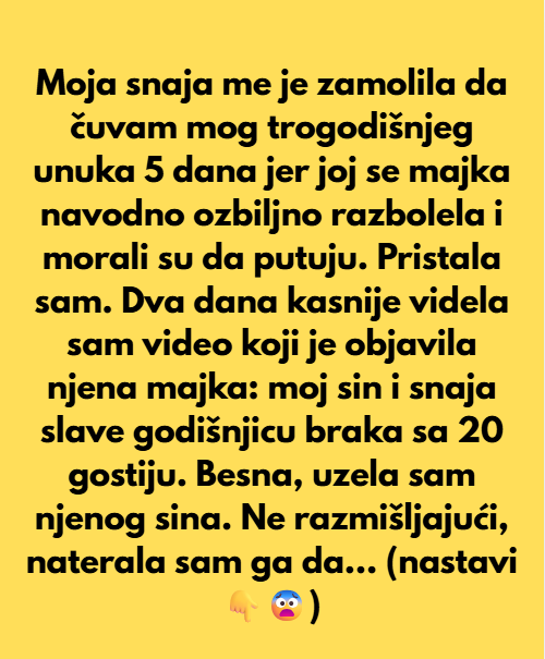 Pre nedelju dana, moja snaja je došla kod mene u suzama i zamolila me da čuvam mog trogodišnjeg unuka 5 dana jer joj se majka ozbiljno razbolela. Zato su ona i moj sin morali da putuju kako bi bili uz nju.