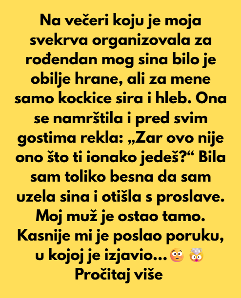 Na večeri je bilo puno hrane, ali za mene su bili samo kockice sira i kruh. Podrugljivo se nasmijala i rekla pred svima: