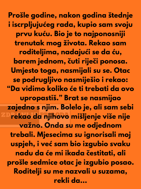 Prošle godine, nakon godina štednje i iscrpljujućeg rada, kupio sam svoju prvu kuću. Bio je to najponosniji trenutak mog života. Rekao sam roditeljima, nadajući se da ću, barem jednom, čuti riječi ponosa. Umjesto toga, nasmijali su se. Otac se podrugljivo nasmiješio i rekao: “Da vidimo koliko će ti trebati da ovo upropastiš.” Brat se nasmijao zajedno s njim. Bolelo je, ali sam sebi rekao da njihovo mišljenje više nije važno.