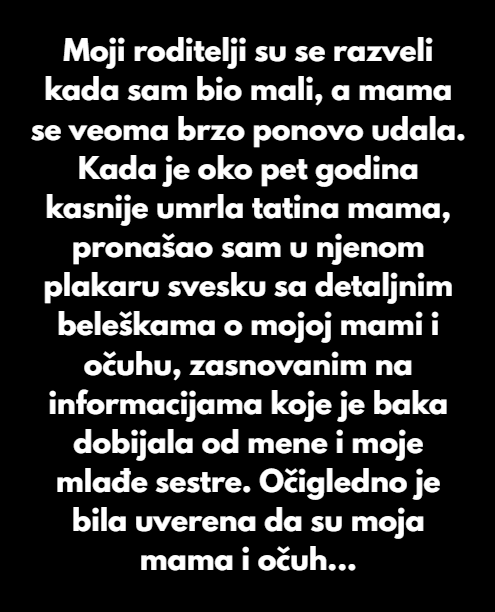Moji roditelji su se razveli kada sam bio mali, a mama se veoma brzo ponovo udala. Kada je oko pet godina kasnije umrla tatina mama, pronašao sam u njenom plakaru svesku sa detaljnim beleškama o mojoj mami i očuhu, zasnovanim na informacijama koje je baka dobijala od mene i moje mlađe sestre.