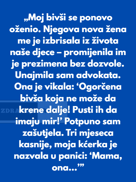 Moj bivši se ponovo oženio. Njegova nova žena me je izbrisala iz života naše djece — promijenila im je prezimena bez dozvole. Unajmila sam advokata. Ona je vrištala: „Ogorčena bivša žena! Pustite djecu da imaju mir!“ Potpuno sam prestala da odgovaram.