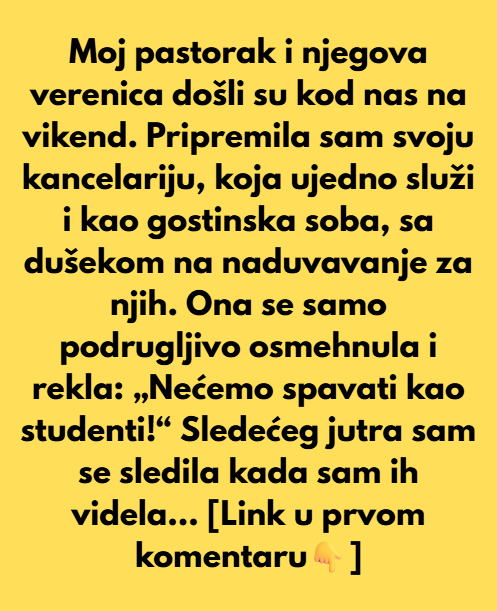 Moj pastorak i njegova verenica došli su kod nas za vikend. Pripremio sam gostinsku sobu, koja je ujedno i moja kancelarija, i naduvao vazdušni dušek za njih. Njegova verenica se podrugljivo nasmejala: „Nećemo spavati kao studenti!“ Sledećeg dana bio sam zatečen kada sam ih video kako ipak vuku svoje torbe u moju kancelariju. Moj sto je bio prekriven njenom šminkom, a njegove cipele su stajale preko mojih dokumenata.
