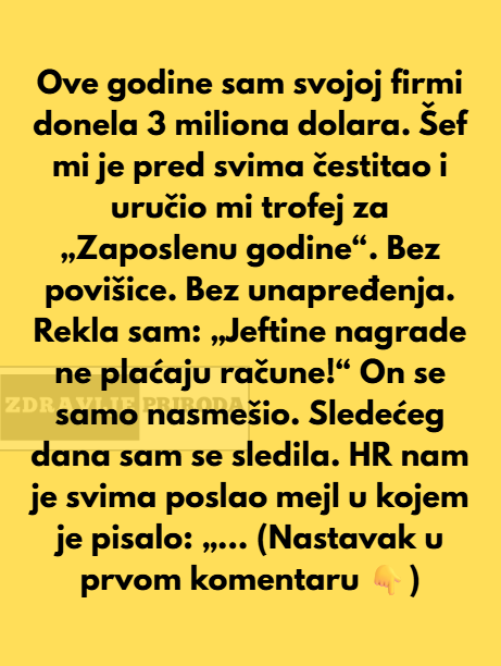 Šef mi je pred svima čestitao i uručio mi trofej za „Zaposlenu godine“. Bez povišice. Bez unapređenja. Bez ičega.