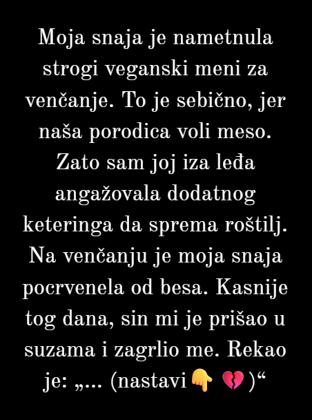 Mislim da je to jako sebično s njene strane, s obzirom na to da naša strana porodice voli meso. Zato sam joj iza leđa angažovala dodatnog keteringa da pripremi šnicле i roštilj, jer sam željela da se svi dobro provedu.