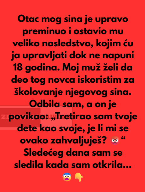 Odbila sam, a on je povikao: „Tretirao sam tvoje dete kao svoje, je li mi se ovako zahvaljuješ?“ Rekla sam mu: „Žao mi je, ali to što si odgajao mog sina ne daje ti pravo na njegov novac!“