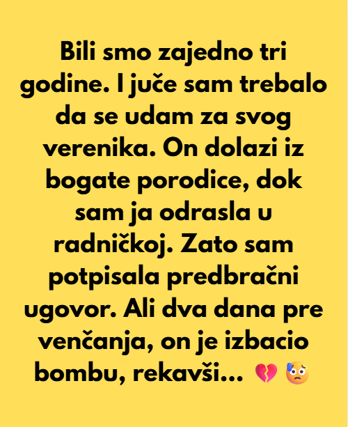 Bila sam šokirana. „Zašto o ovome pričamo tek sada? Nikada pre nismo pomenuli predbračni ugovor.“