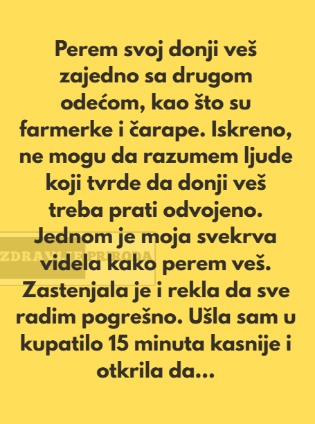 Jednom je moja svekrva videla kako perem veš. Zastenjala je i rekla da sve radim pogrešno. Ušla sam u kupatilo 15 minuta kasnije i otkrila da je zaustavila mašinu, izvadila muževljeve gaće, moje vratila unutra i ponovo je uključila.