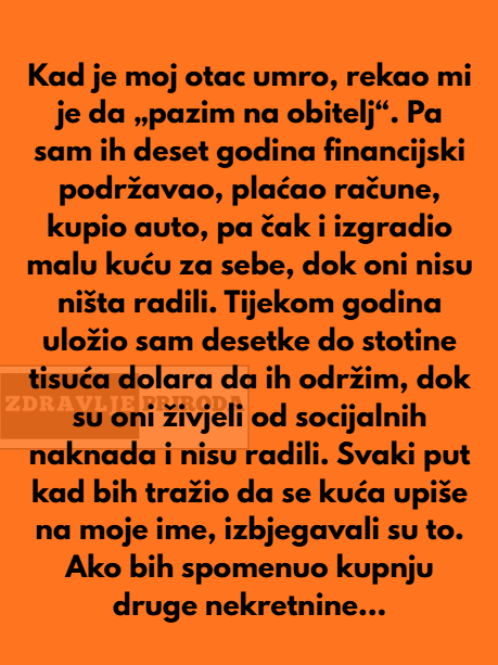 Kad je moj otac umro, rekao mi je da „pazim na obitelj“. Pa sam ih deset godina financijski podržavao, plaćao račune, kupio auto, pa čak i izgradio malu kuću za sebe, dok oni nisu ništa radili. Tijekom godina uložio sam desetke do stotine tisuća dolara da ih održim, dok su oni živjeli od socijalnih naknada i nisu radili.