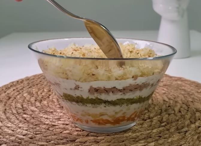 Krompir i šargarepu kuvajte u posoljenoj vodi oko 40 minuta, pa ih procedite i ostavite da se povrće ohladi. Zatim izrendajte, pa sastojke slažite u činiju ovim redom: