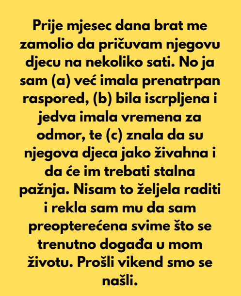 Prije mjesec dana brat me zamolio da pričuvam njegovu djecu na nekoliko sati. No ja sam (a) već imala prenatrpan raspored, (b) bila iscrpljena i jedva imala vremena za odmor, te (c) znala da su njegova djeca jako živahna i da će im trebati stalna pažnja. Nisam to željela raditi i rekla sam mu da sam preopterećena svime što se trenutno događa u mom životu.