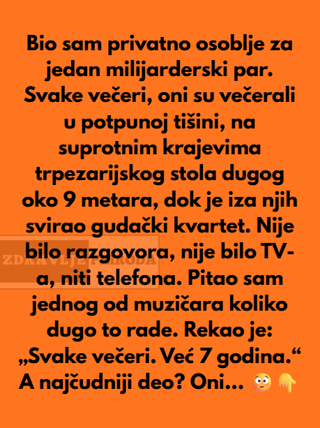 Radio sam kao privatno osoblje za milijarderski par. Svake večeri, oni su večerali u potpunoj tišini, na suprotnim krajevima trpezarijskog stola dugog oko 9 metara, dok je iza njih uživo svirao gudački kvartet. Nije bilo razgovora, nije bilo TV-a, niti telefona. Samo viljuške, noževi i Betoven.