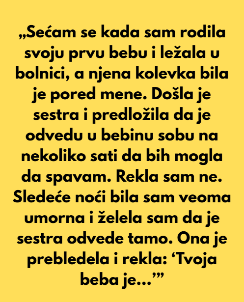 Slećeg dana sam bila jako umorna i pitala sam sestru da li može da odvede bebu u tu sobu na par sati. Ta sestra je prebledela i rekla: ‘Vaša beba treba da ostane s vama u sobi. Mi nemamo bebinu sobu. Niko nikada ne bi došao da uzme vašu bebu!’”