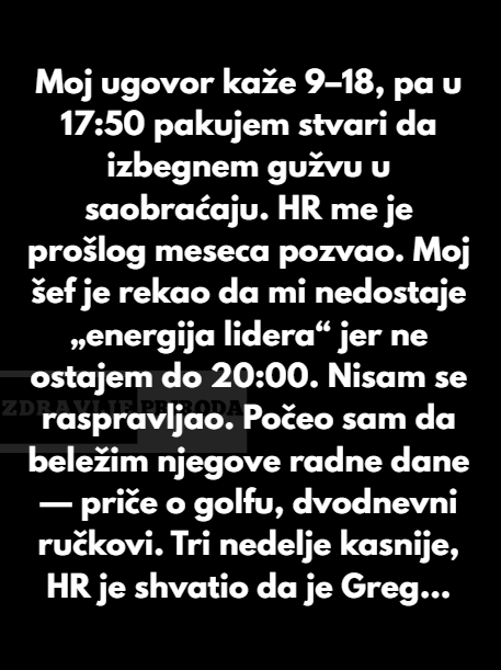 Prošlog meseca, HR me je pozvao. Moj šef Greg sedeo je sa izrazom „razočaranja“. Rekao je HR-u da mi nedostaje „energija lidera“ i da nisam „tim igrač“ jer ne ostajem do 20:00 kao ostali. Greg je tvrdio da je „opterećen“ mojim nedostatkom posvećenosti.