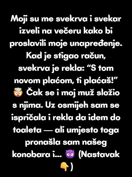 Upravo sam dobila veliko unapređenje na poslu — ono koje ti preko noći udvostruči plaću. Moji su svekar i svekrva bili oduševljeni i odlučili mi prirediti “iznenađenje” — slavlje u skupocjenom restoranu. Pojavilo se dvanaest ljudi.