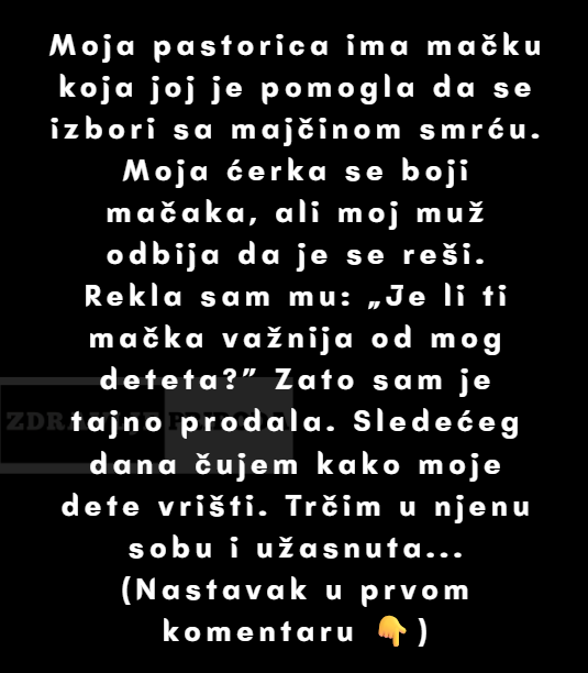 Moja pastorica ima mačku — pomogla joj je da se izbori sa majčinom smrću. Stvar je u tome što se moja ćerka boji mačaka, a mi smo se upravo uselili zajedno. Mislila sam da neće biti veliki problem da se rešimo ljubimca, ali moj muž odbija. Rekla sam: „Da li ti je mačka važnija od mog deteta?“