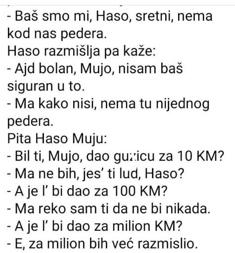 - Eto, vidiš, Mujo, nije da nema pede’ra, nego nema investitora…