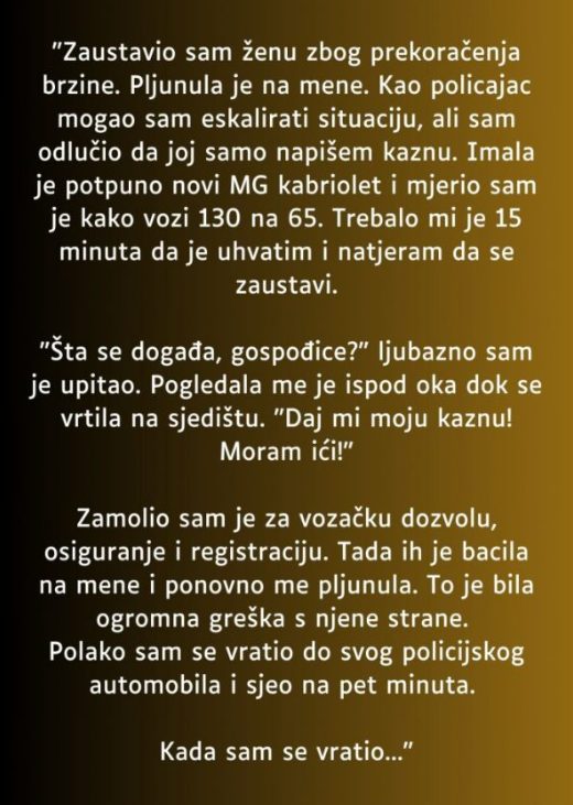 Bilo je to jedno od onih mirnih popodneva na cesti. Patrolirao sam u svom službenom vozilu, slušao ritam motora i posmatrao saobraćaj. Sve je izgledalo obično, dok u retrovizoru nisam ugledao bljesak novog kabrioleta kako juri nevjerovatnom brzinom. Radar je pokazao – 130 na ograničenju od 65. Znao sam da moram reagovati, ali nisam slutio kakva će me scena dočekati.